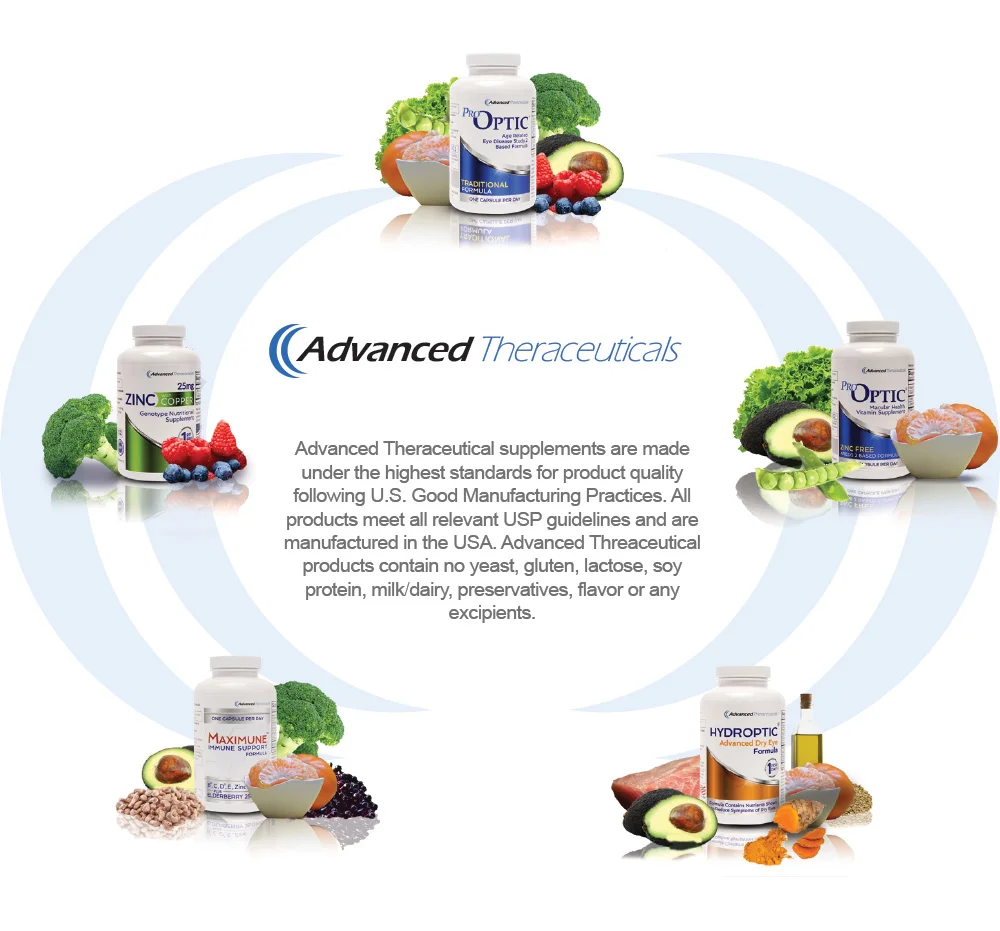 The Age-Related Eye Disease Study 2 (AREDS 2) recommends taking the same vitamins and minerals found in Advanced TheraceuticalsProOptic Formula daily for Adult Macular Degeneration (AMD). The study’s findings were that supplements like those found in our Pro Optic Formulas could help to reduce your patient’s risk of AMD particularly for those who have already lost vision due to AMD in one eye.
